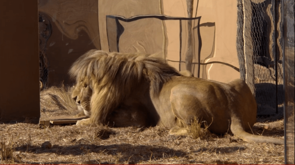 Only one male was observed to be tested, as he was “the male” of the pride. Upon encountering the mirror, the male lion focused all his attention on attempting to physically and aggressively engage his reflection. This is a typical response to encountering an outsider male lion. The male lion never attended to his trainer, or attempted to leave to mirror, focusing on his reflection.